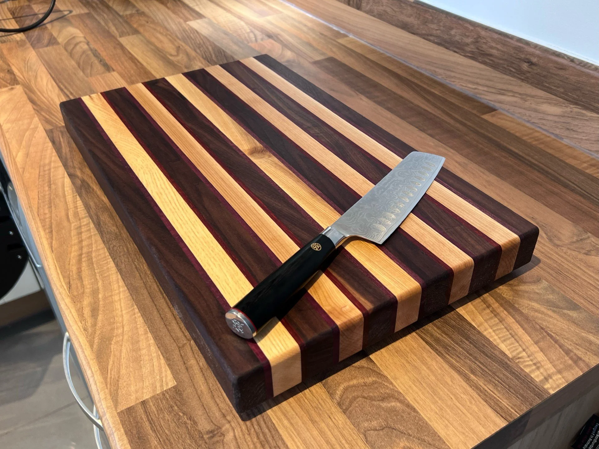 Made with American Maple, American black walnut, Bubinga, and Purple heart. The board measures 48cm by 29cm It is 40mm thick and weighs 4.2kg.